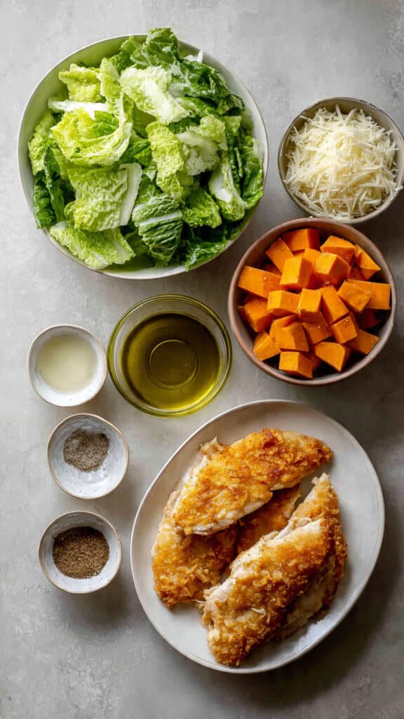 - Serve and Enjoy: Combine lettuce, roasted sweet potatoes, chicken, parmesan, and Caesar dressing in a large bowl and toss gently.