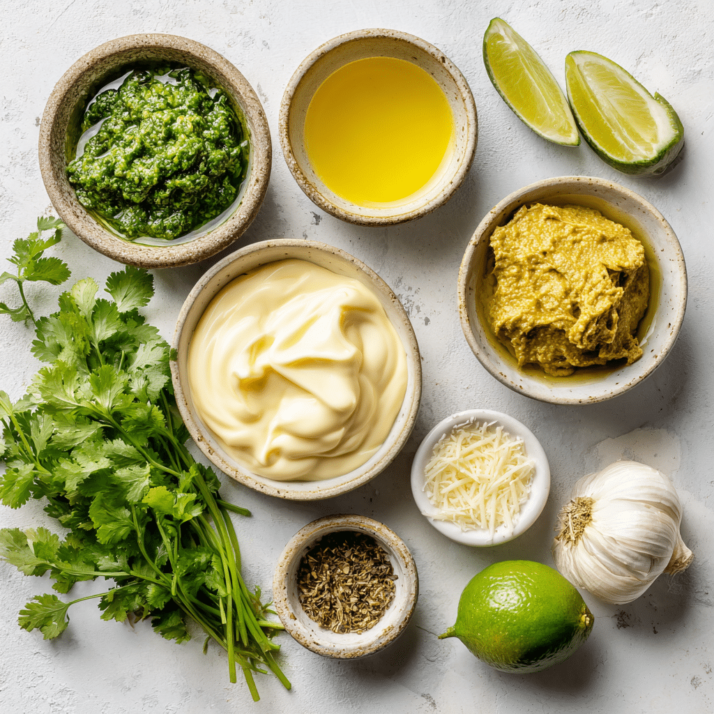 Aji Verde is all about creamy-meets-fresh. The smooth base from mayonnaise and oil carries the earthy freshness of cilantro and the subtle heat of the peppers. The Parmesan adds a savory undertone, while lime juice gives it that pop of brightness that keeps you coming back for more.