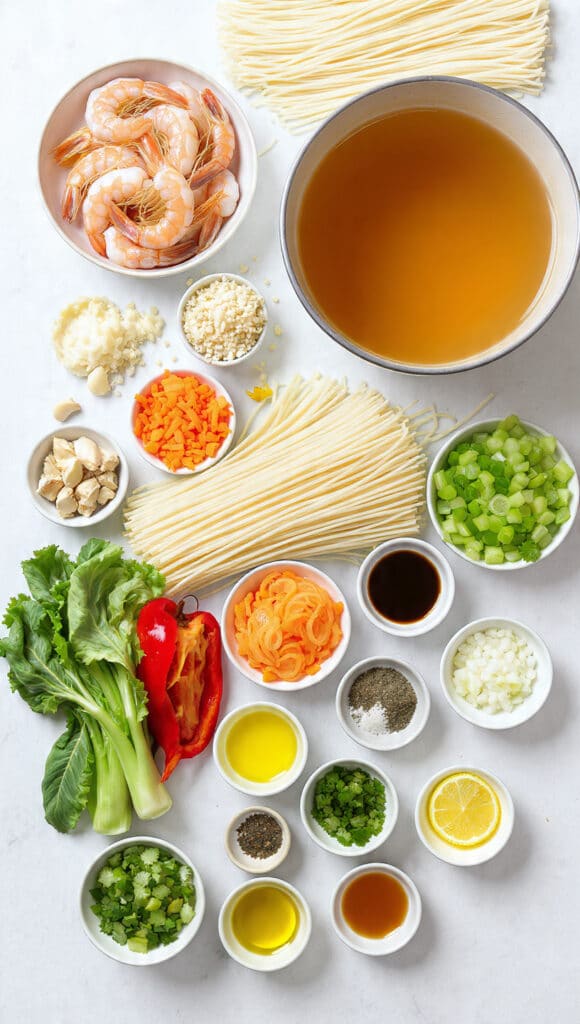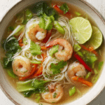 A light yet deeply flavorful shrimp soup with silky rice noodles, fresh vegetables, and a fragrant ginger garlic broth finished with bright lime.