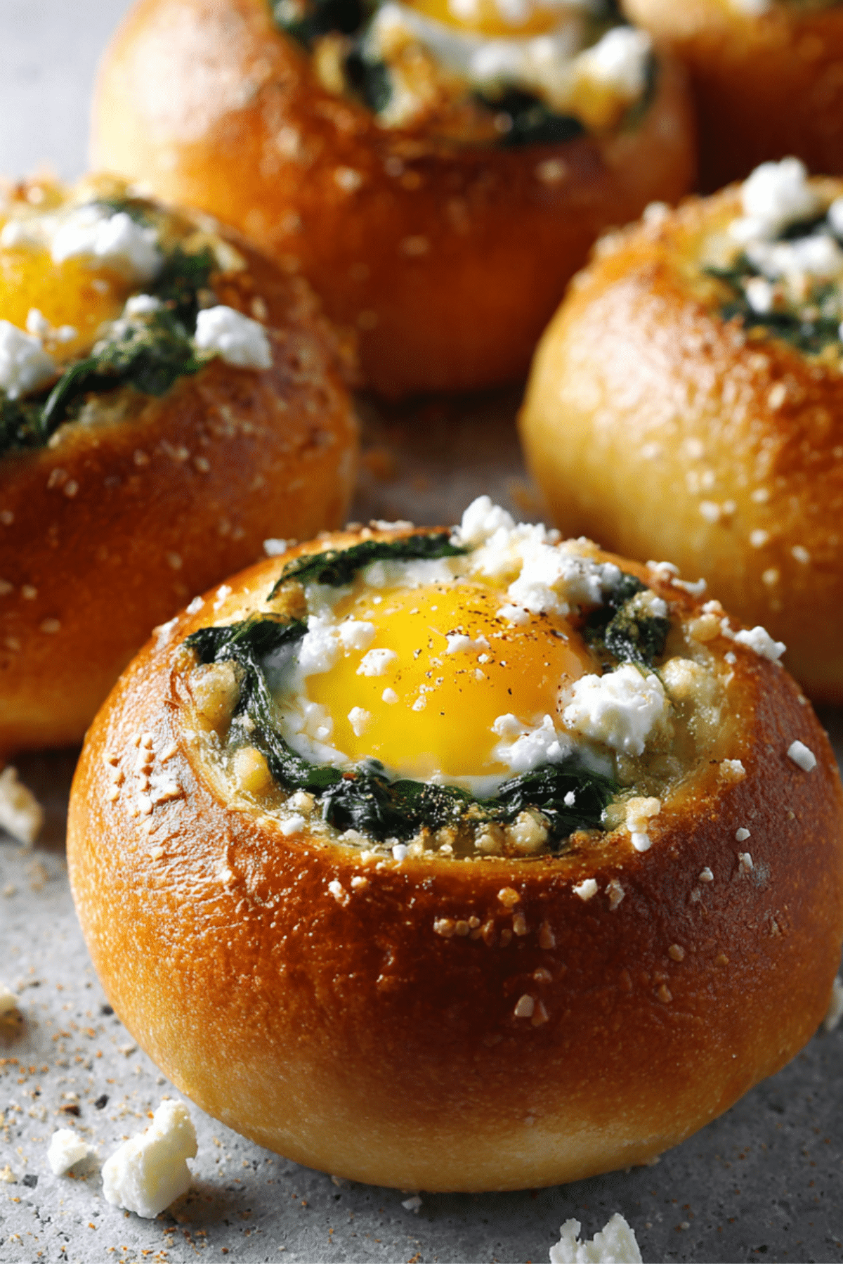 Soft, fluffy baked buns filled with creamy eggs, savory spinach, and tangy feta, creating a warm and comforting breakfast or brunch dish.