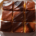 While the cake bakes, prepare the glaze by heating butter, cocoa powder, milk, and powdered sugar in a saucepan until smooth. Let the cake cool slightly, then pour the warm glaze over the top. - Serve and Enjoy: