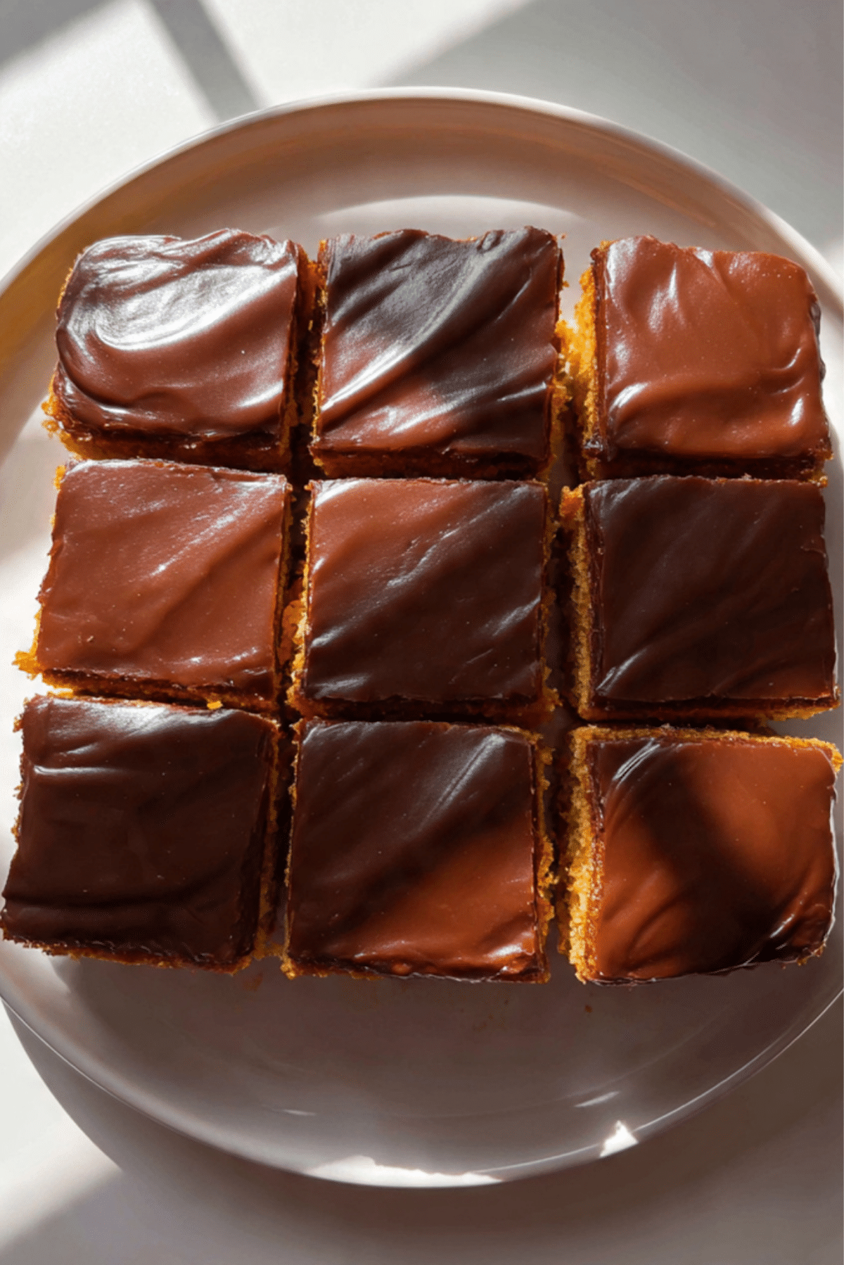Slice the cake into clean, even squares and drizzle extra glaze over the top for shine. Garnish with thin carrot ribbons or shaved chocolate curls for visual appeal. A dusting of powdered sugar along the edges adds that final bakery touch.