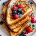 Soft and buttery brioche French toast with a golden crisp exterior and tender custardy center, lightly spiced with cinnamon and vanilla, then topped with fresh berries and maple syrup.
