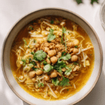 A comforting Burmese-inspired soup made with a savory golden broth, tender glass noodles, chickpeas, soft cabbage, and crispy vegetable samusas that soak up flavor while keeping a satisfying bite.