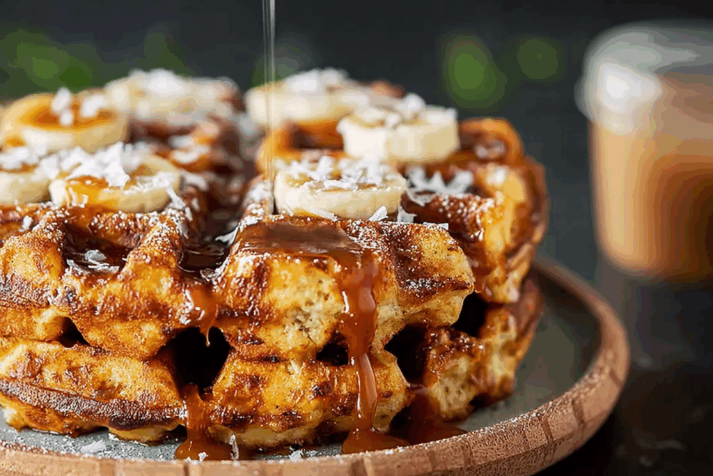A tropical twist on a breakfast classic, this Caramelized Coconut Banana Bread Waffle French Toast combines banana bread, coconut milk, and caramel for a golden, crispy, and irresistibly sweet dish perfect for brunch or dessert.