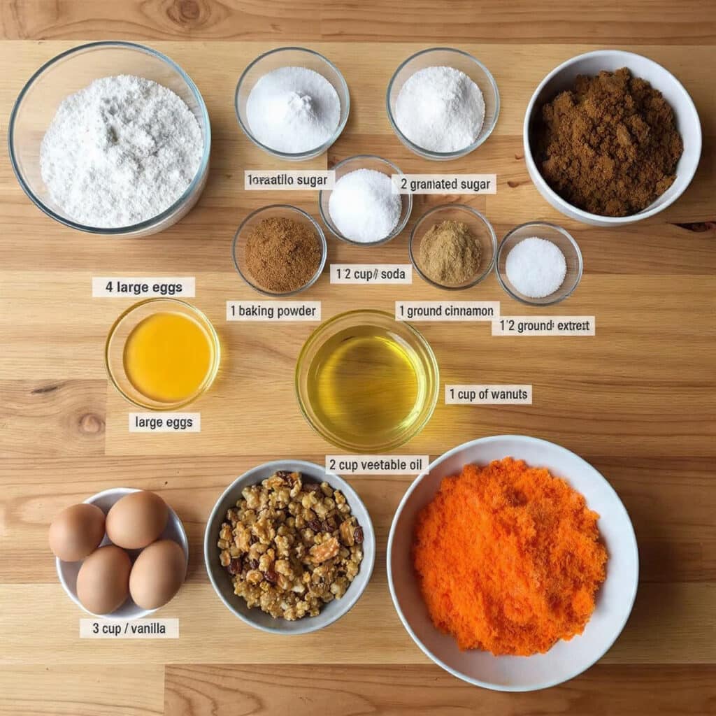 - Grated carrots: 3 cups (firmly packed) — The star of the show, providing moisture and natural sweetness.