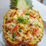 Pineapple fried rice has roots in Southeast Asian cuisine, especially Thai cooking, where sweet and savory flavors live happily side by side. Traditionally, it is often served in a carved pineapple shell, which makes it both beautiful and practical.