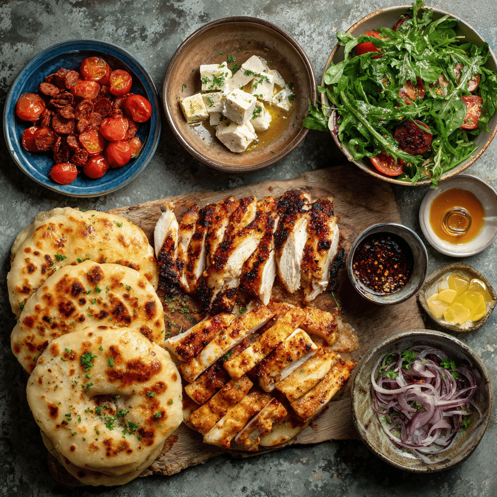 Warm flatbreads or bagels layered with juicy marinated chicken, smoky chorizo, golden grilled halloumi and a sticky hot honey drizzle, balanced with fresh salad and herbs for a sweet, spicy, and savory handheld feast.