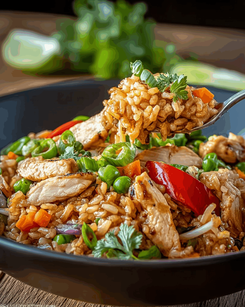 - Combine Ingredients: Scramble eggs, then add rice, chicken, peas, carrots, and bell pepper. Stir-fry for 3–5 minutes.