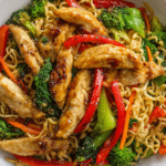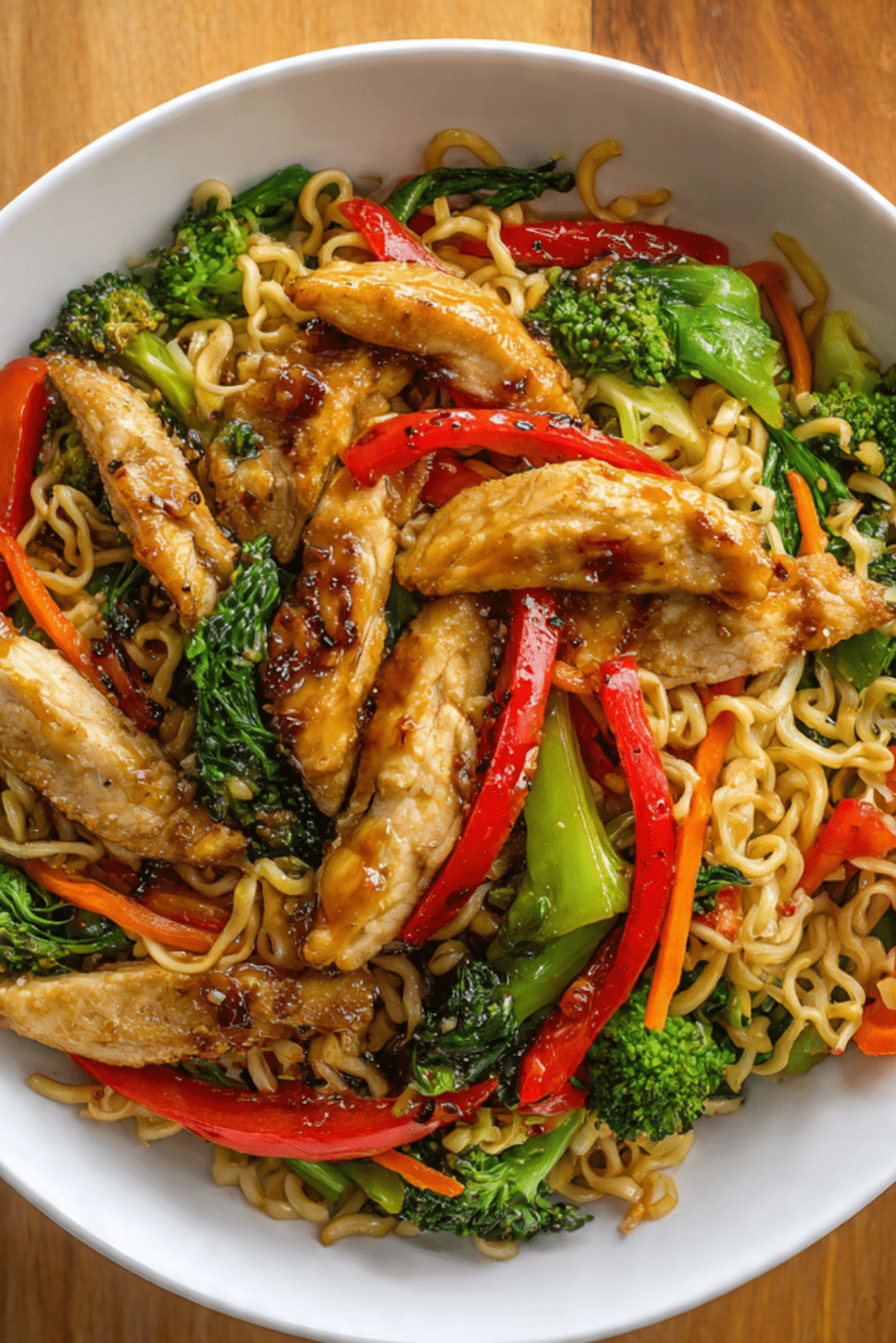 This Chicken Stir Fry is a fast, flavorful dinner packed with tender chicken, crisp vegetables, and chewy ramen noodles tossed in a savory garlic-ginger sauce. Perfect for weeknights or meal prep!