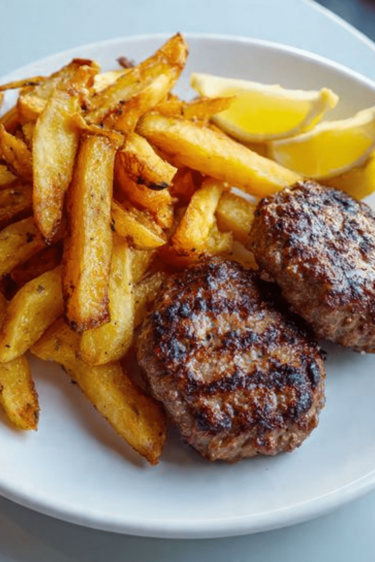 Juicy, herb-infused Greek-style biftekia served with golden, crispy hand-cut chips. A rustic and comforting Mediterranean classic perfect for any meal.