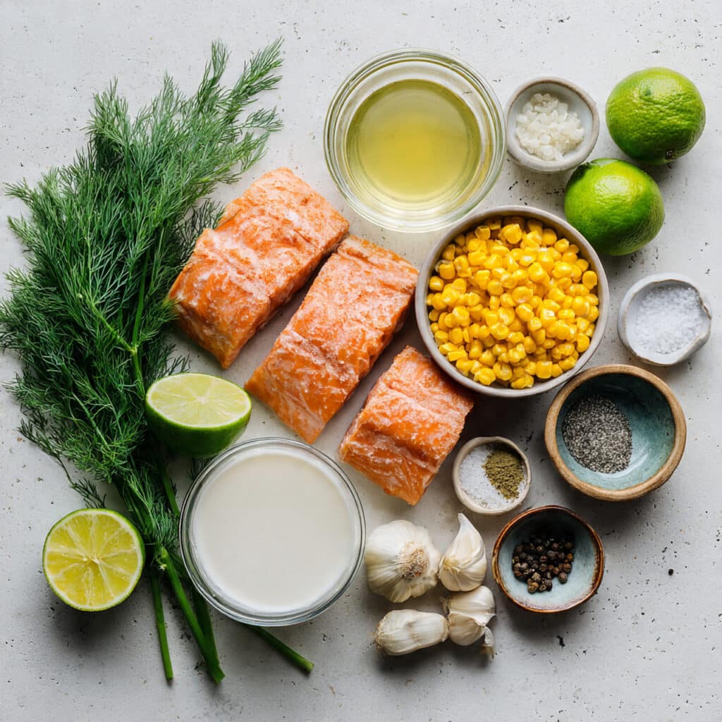 Ingredients in Coconut-Poached Salmon with Corn and Dill