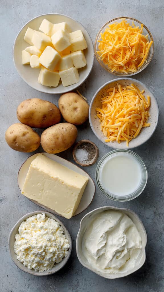- Assemble the Dish: Mash the potatoes with butter, warm milk, sour cream, cream cheese, salt, and pepper until smooth, then fold in 1 cup of the shredded cheese.