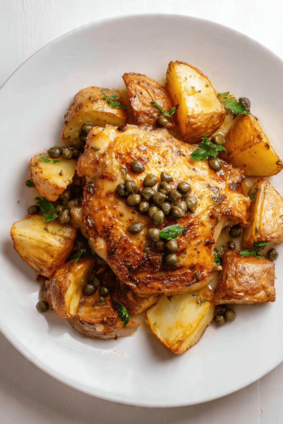 Crispy Lemon Chicken with Potatoes, Oregano, and Capers is a one-pan wonder with juicy chicken thighs, golden roasted potatoes, and bright, briny flavor from lemon and capers. Perfect for a cozy dinner.