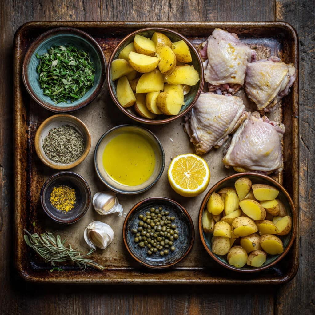 Ingredients in Crispy Lemon Chicken with Potatoes, Oregano, and Capers