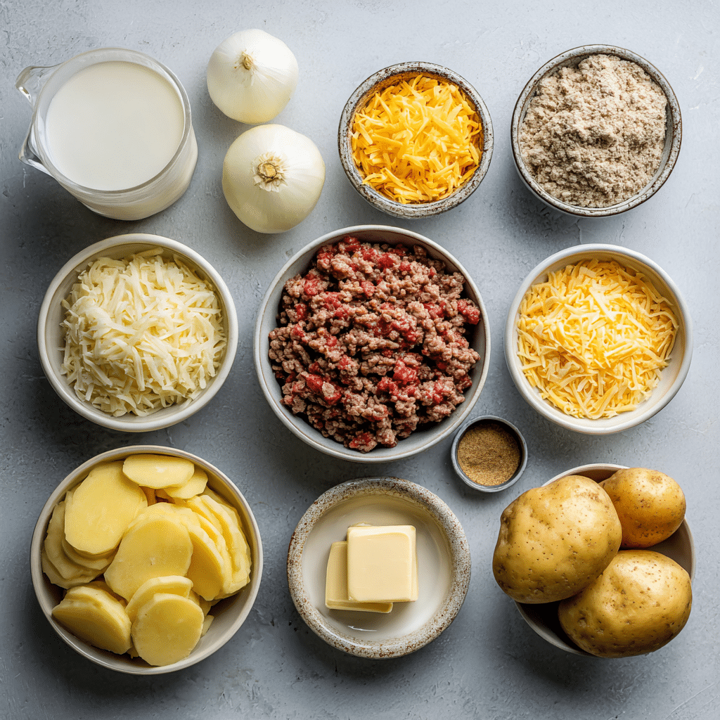 - Potatoes: 5 medium (thinly sliced) — create the creamy, layered texture.