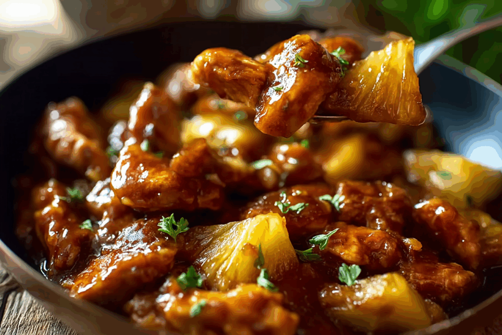 Tender slow-cooked chicken simmered in pineapple and smoky barbecue sauce until glossy and shreddable, served over rice or in sandwiches for an easy, crowd-pleasing meal.
