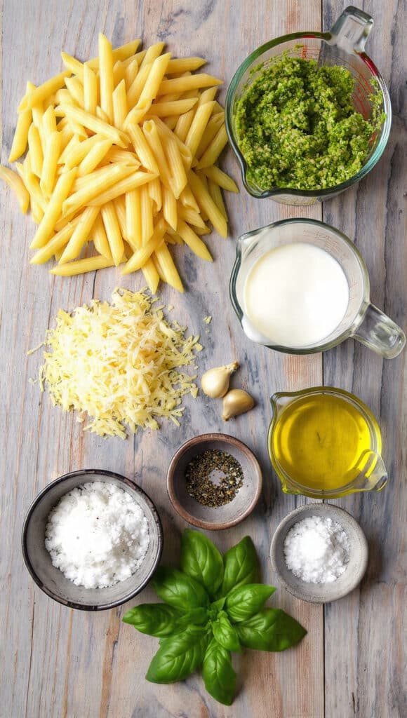 Basil Pesto: This is the heart of the dish. Its fresh, aromatic quality gives the pasta its signature flavor and color.