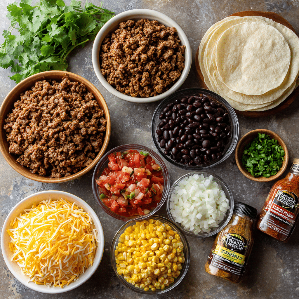 - Combine Ingredients: In a large skillet over medium heat, add olive oil and sauté the diced onion until soft. Add the ground beef, cook until browned, then stir in taco seasoning, black beans, corn, and salsa. Simmer for 5 minutes.