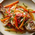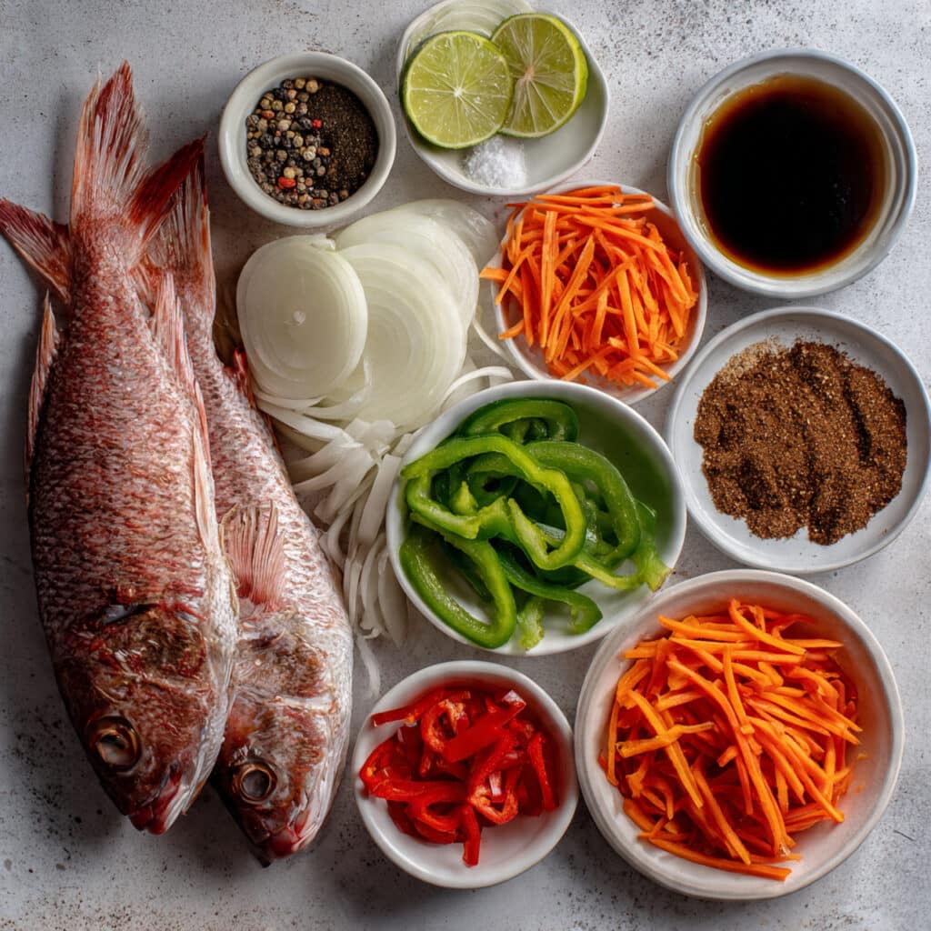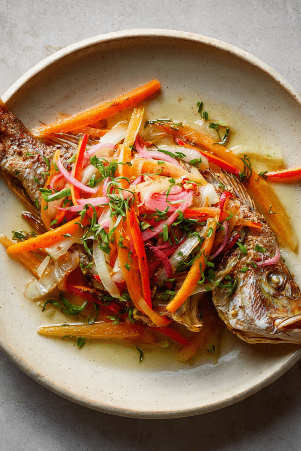 Crispy fried red snapper topped with a vibrant, tangy-sweet medley of pickled vegetables, this Jamaican Escovitch Fish brings bold island flavor to your table with every bite.