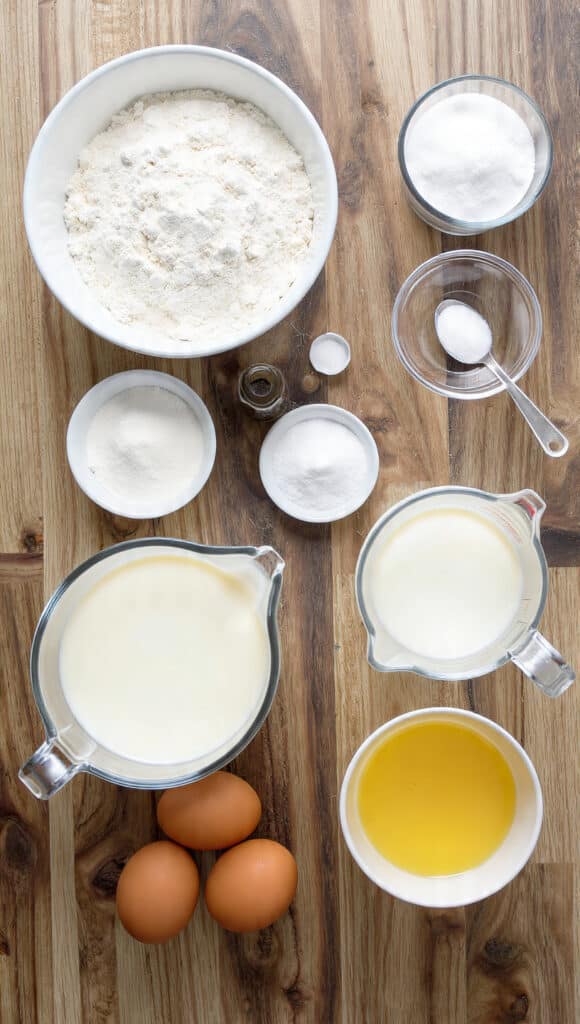 - In another bowl whisk buttermilk, eggs, melted unsalted butter, and vanilla extract.