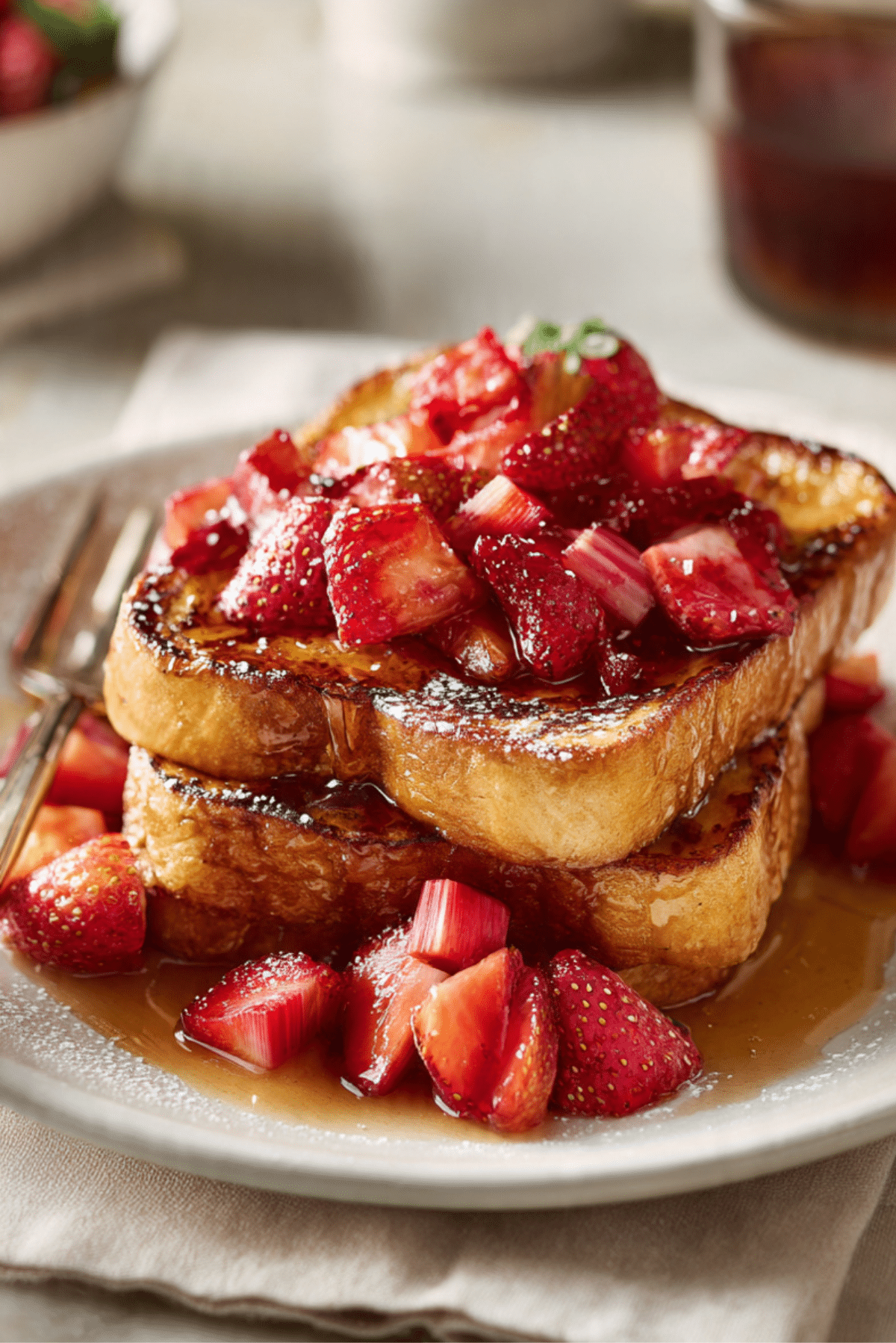 A cozy, comforting French toast topped with sweet roasted strawberries and tender rhubarb, perfect for a vibrant brunch or slow morning breakfast.