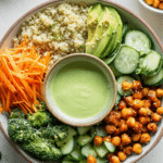 There is something almost magical about sitting down to a bowl that feels like pure nourishment. The colors alone pull you in, bright greens, warm golden chickpeas, soft orange carrots, and that creamy green dressing that ties everything together. It feels fresh, vibrant, and honestly a little bit indulgent in the best way. Trust me, you’re going to love this. It is the kind of meal that makes you feel good while still tasting absolutely incredible.