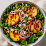 A vibrant Grilled Peach Salad with caramelized peaches, fresh greens, creamy goat cheese, and toasted pecans, finished with a light balsamic dressing.