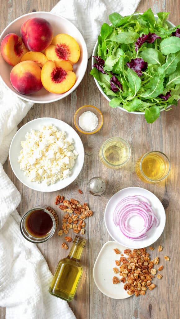- Finishing Touches: In a large bowl combine greens, red onion, toasted pecans, and sliced grilled peaches. Drizzle with dressing and toss gently. Sprinkle goat cheese on top.