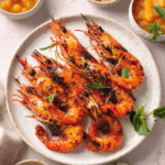 Smoky grilled prawns paired with a fresh mango chili dip that balances sweetness, heat, and brightness.
