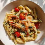 There is something instantly comforting about a bowl of pasta that still feels a little special. This dish brings together juicy grilled prawns, tender penne, and a creamy sauce that smells like garlic the moment it hits the pan. Trust me, you’re going to love this, because it feels like a restaurant plate but comes together in your own kitchen without stress.