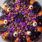 This Halloween Layer Cake features bold orange, purple, and black layers with rich chocolate ganache, topped with spooky candy eyes and festive sprinkles. A true showstopper for any Halloween party!