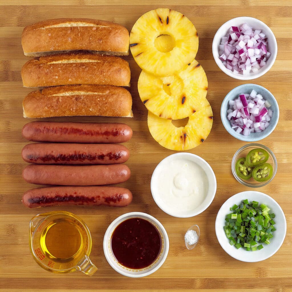 Keywords: Hawaiian hot dog, tropical hot dog, grilled pineapple hot dog, teriyaki hot dog, summer BBQ recipe