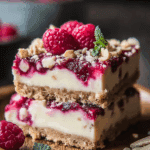 Creamy, tangy cheesecake layered over a buttery graham cracker crust, swirled with vibrant raspberry jam and topped with fresh raspberries. These bars are easy to make, chill beautifully, and slice into elegant squares for parties or everyday treats.