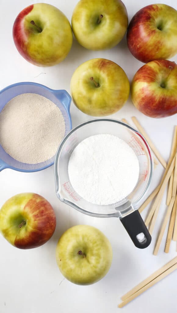 - Wash and thoroughly dry the apples, then insert wooden sticks into the tops and set aside.