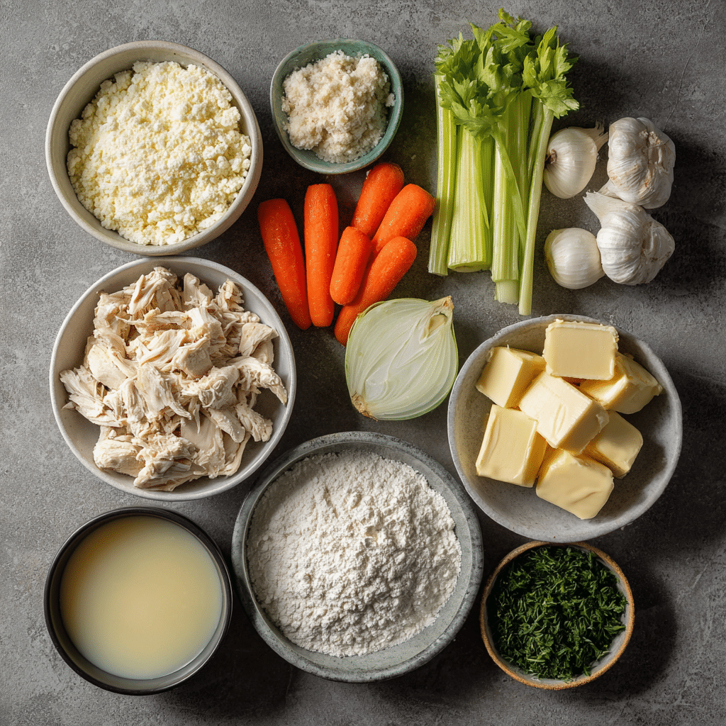 - Combine Ingredients: Melt butter, then sauté onion, celery, carrots, and garlic until tender. Stir in flour to make a roux.