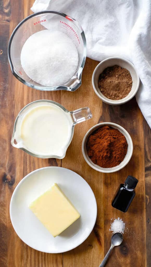 - Add granulated sugar, unsweetened cocoa powder, heavy cream, unsalted butter, and salt. Whisk until smooth.