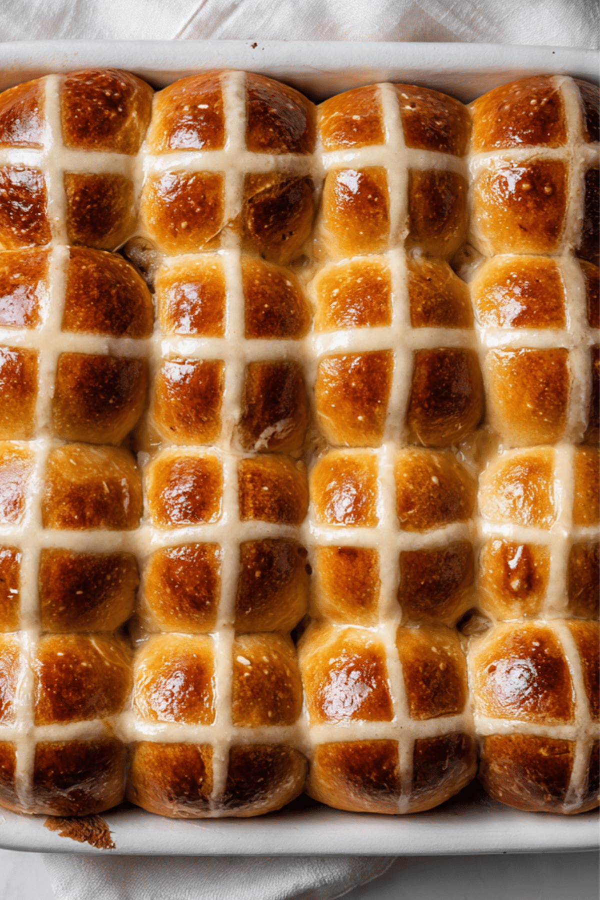 These traditional Hot Cross Buns are soft, lightly spiced, and studded with sweet dried fruit. Topped with the signature cross and a shiny glaze, they’re perfect for Easter or any cozy occasion.