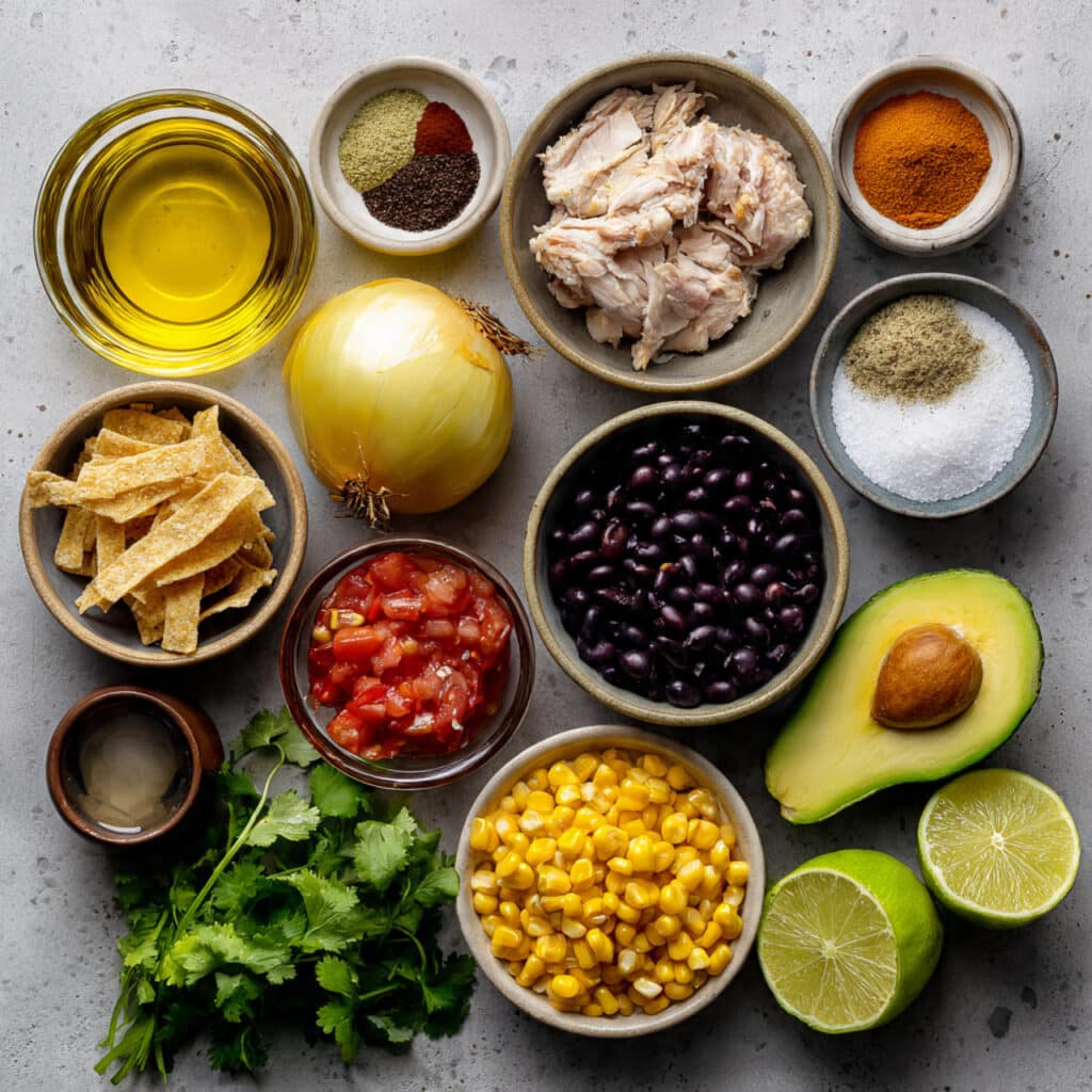 - Corn Tortilla Strips: 1 cup — for crunch and texture on top.