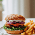 There is something deeply satisfying about holding a warm burger in your hands, feeling the soft bun give way to a hearty filling, and knowing every bite is packed with flavor. This Juicy Vegan Burger with Fries brings all that comfort without any compromise. Crisp lettuce, creamy sauce, a savory plant based patty, and golden fries on the side. Trust me, you’re going to love this.