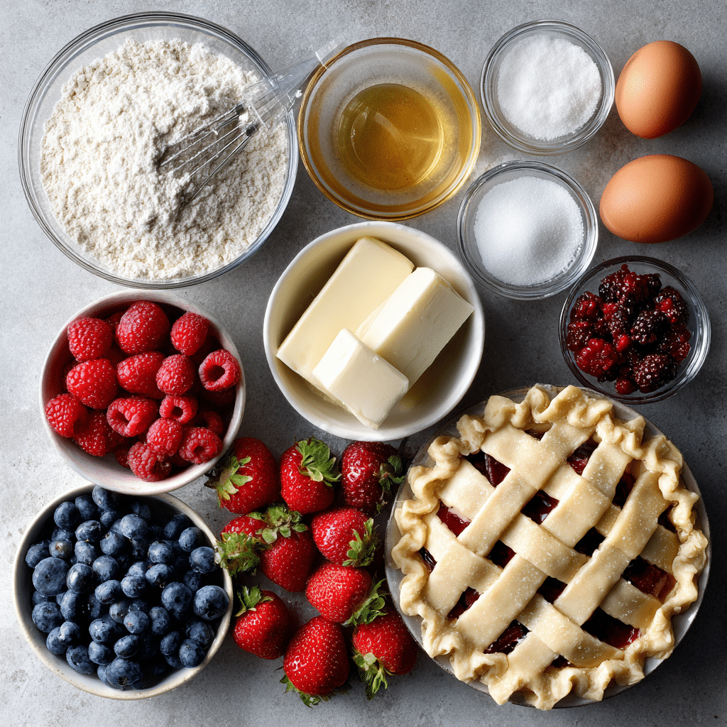 - Mixed berries (blueberries, raspberries, strawberries): 4 cups, the star of the pie with juicy, colorful flavor.