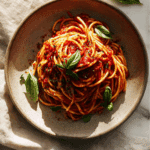 This sauce is all about slow building flavor. The long simmering time helps the tomato’s natural sweetness emerge, while the garlic and onion melt into the background, creating a sauce that’s rich but not heavy. The crushed red pepper adds a tiny spark of heat, balanced by the sugar and the creamy mouthfeel from the olive oil. The final addition of basil gives it a fresh, almost sweet herbal note that ties it all together.