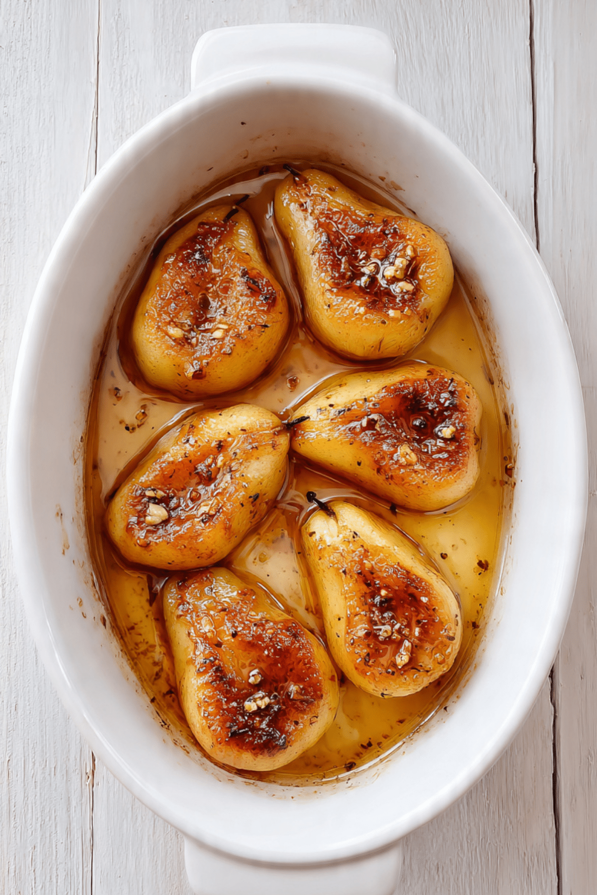 - Assemble the Dish: Spoon the maple mixture evenly over each pear half, letting it pool in the hollowed centers.