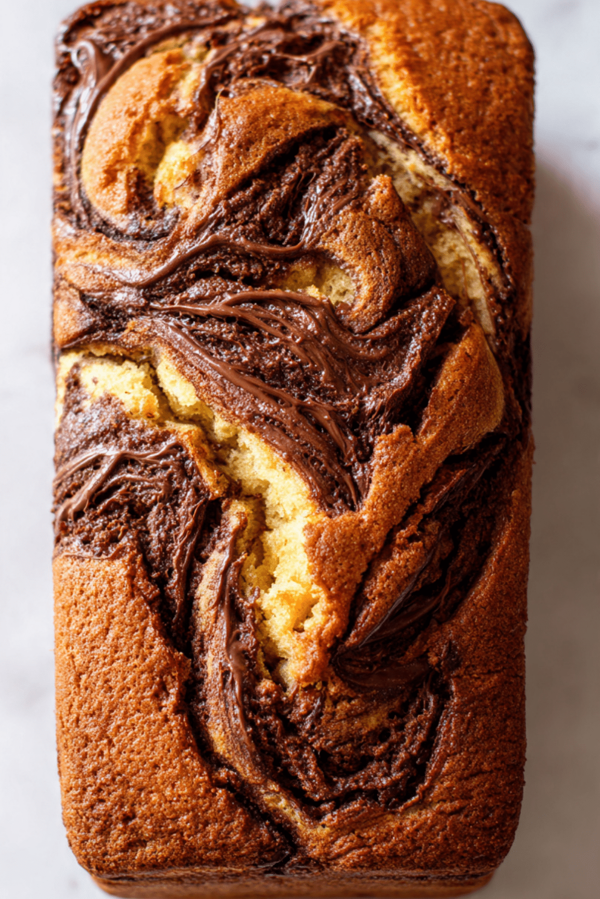A rich and buttery pound cake swirled with creamy chocolate hazelnut spread, baked to golden perfection with a tender crumb and beautiful marbled interior.