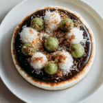 Top with evenly spaced onde-onde balls and sprinkle coconut lightly around the edges. A glossy chocolate surface makes it shine beautifully under soft light.