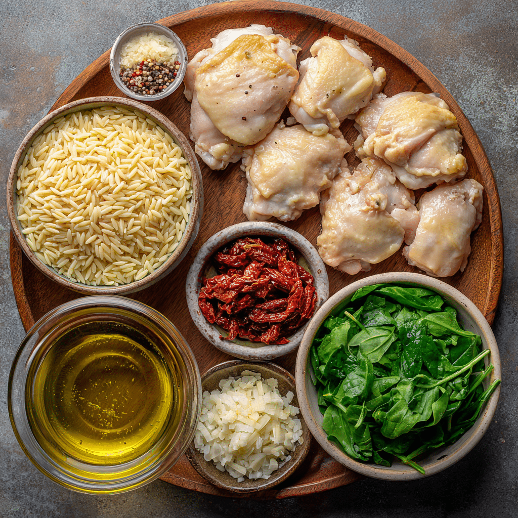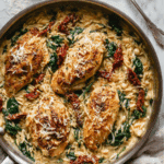 A comforting one-skillet meal of creamy orzo cooked with golden seared chicken, Parmesan cheese, spinach, and sun-dried tomatoes. It’s rich, flavorful, and perfect for a cozy dinner without the mess.