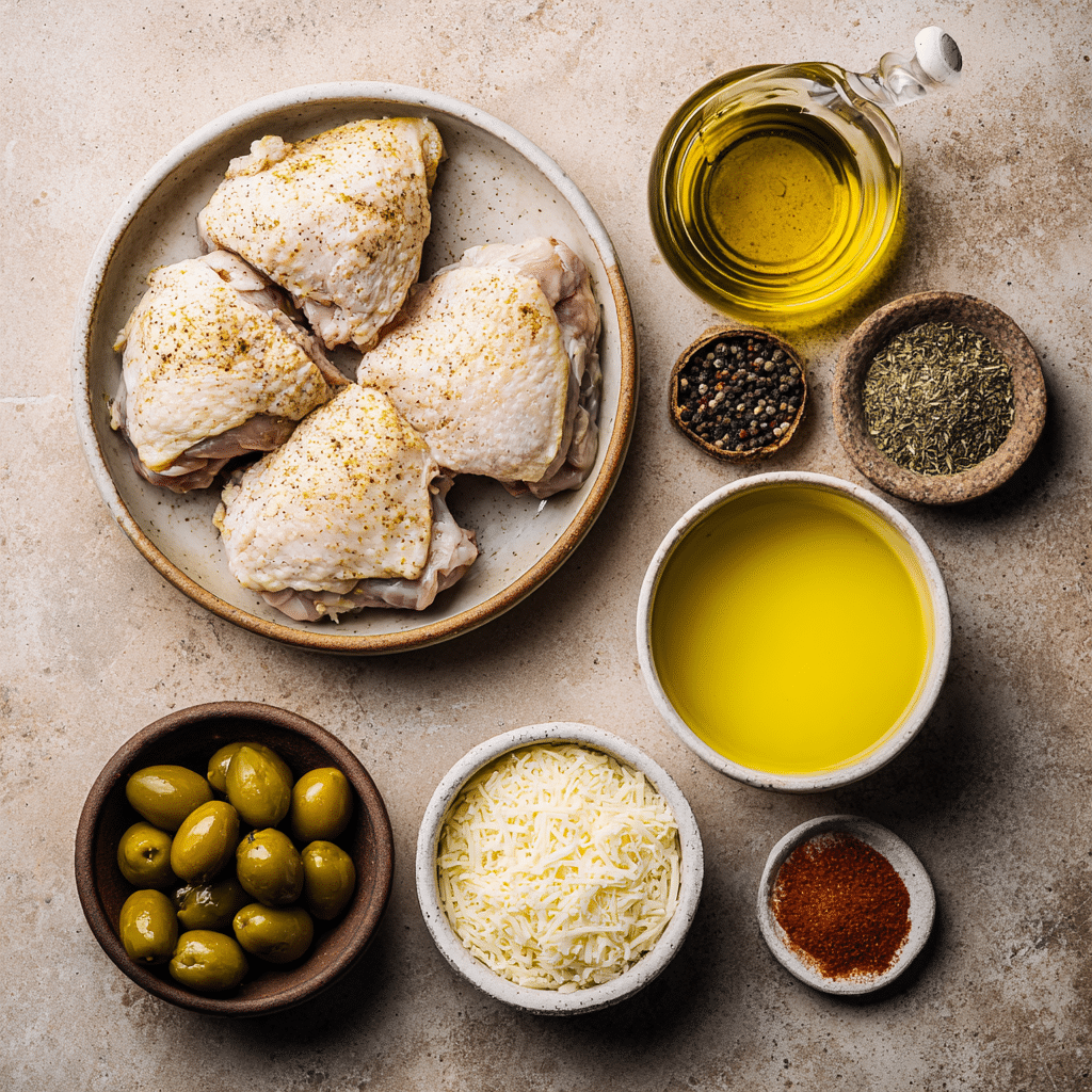 Heat olive oil in a large cast iron skillet over medium-high heat. Sear the chicken skin-side down until golden, about 5 minutes per side. Remove and set aside. - Assemble the Dish: