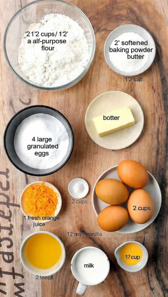 - Combine Ingredients: In a bowl, whisk together flour, baking powder, and salt. In another, cream butter and sugar until light and fluffy. Beat in eggs one at a time, then mix in orange juice, zest, and vanilla. Gradually add dry ingredients alternately with milk, mixing gently.