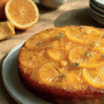 A moist and golden Orange Upside-Down Cake with caramelized orange slices glistening on top, combining sweet citrus brightness with buttery richness for a dessert that feels like sunshine on a plate.