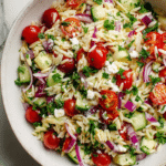 A fresh and vibrant orzo salad tossed with cherry tomatoes, crisp cucumber, red onion, creamy feta, and a bright lemon olive oil dressing. Perfect as a light meal or colorful side dish.